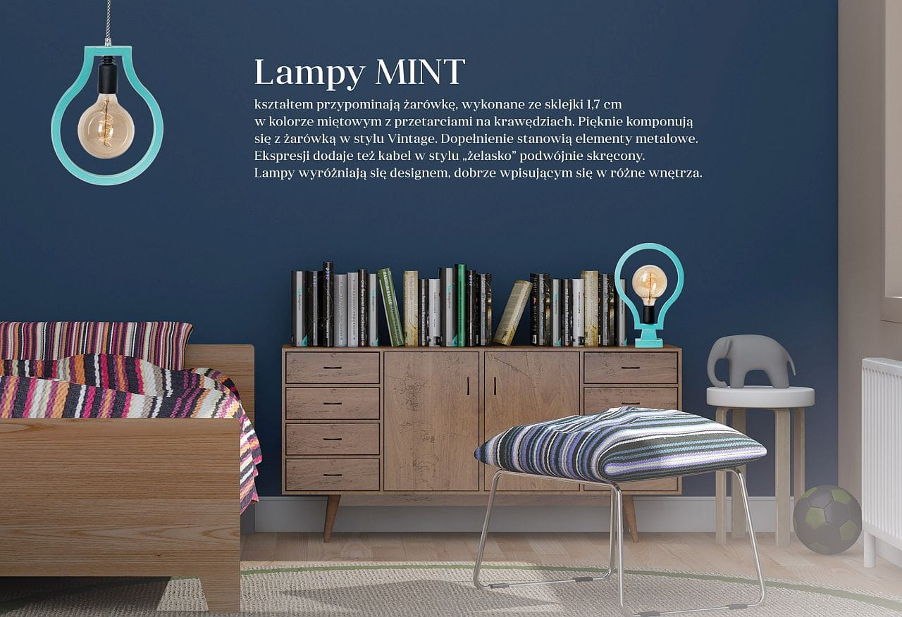 z żarówką w stylu Vintage. Dopełnienie stanowią elementy metalowe. Ekspresji dodaje też kabel w stylu „żelazko” podwójnie skręcony. Lampy wyróżniają się designem, dobrze wpisującym się w różne wnętrza.