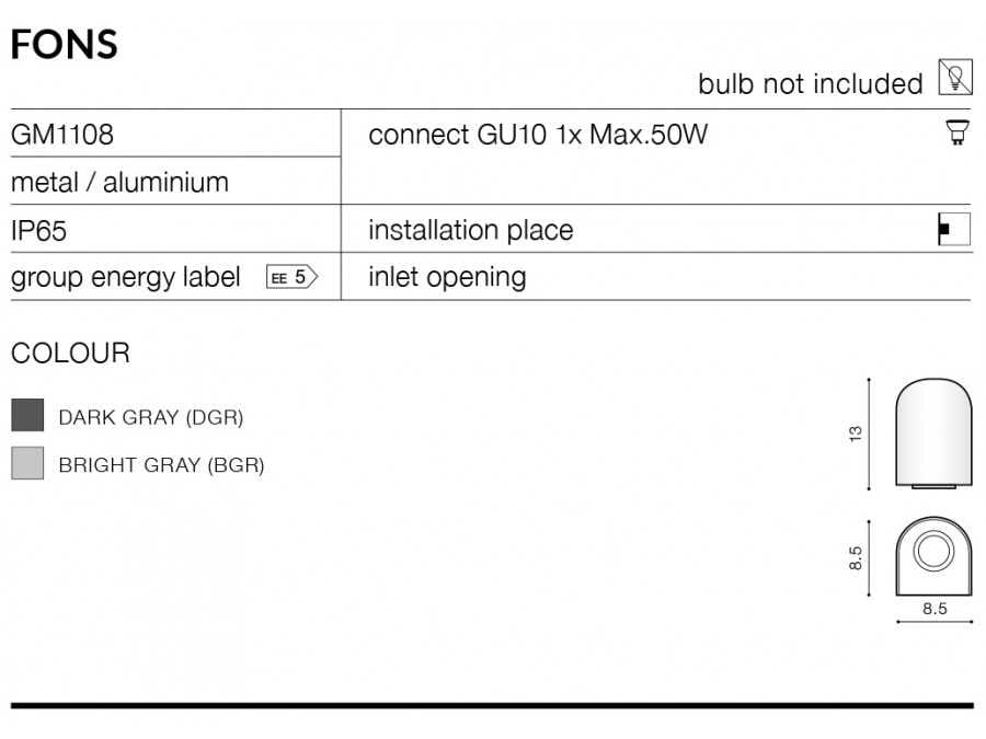Lampa FONS ma bardzo ciekawy kształt, jednocześnie nieskomplikowany dzięki czemu można lampę powiesić w różnego rodzaju aranżacjach. Lampa zewnętrza doskonale oświetli, np fasadę budynku dzięki dość ostremu kątowi padania światła. Może być wykorzystana jako oświetlenie korytarza, garażu i różnego rodzaju przejść. Szczególnie ładny efekt zapewnia zamontowana w rzędzie kinkietów w niewielkich odległościach. Lampa wykonana jest z metal/aluminium.
