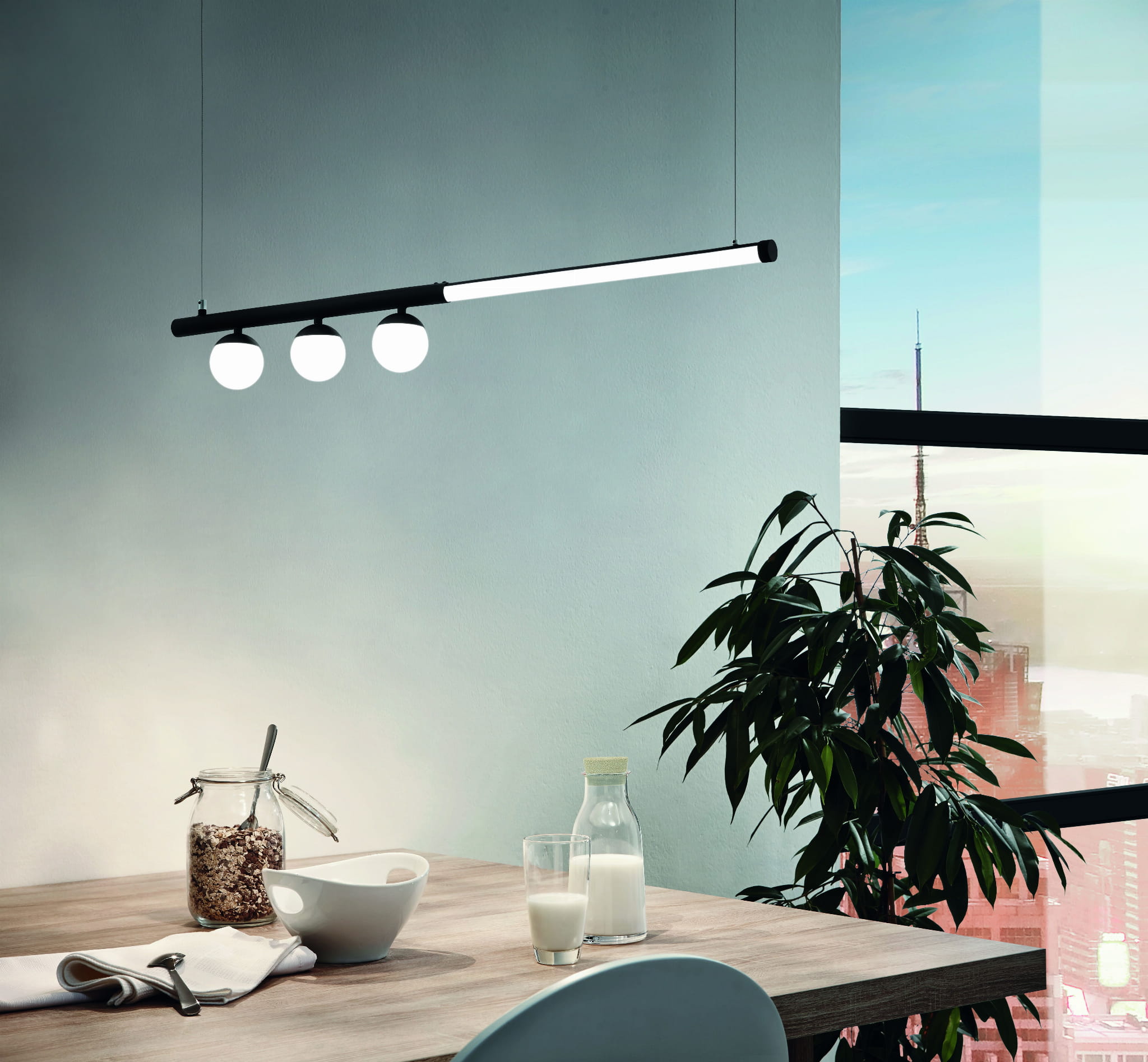 Dizajnerska lampa wisząca LED PHIANEROS wykonana z zaokrąglonego, metalowego profilu LED z plastikową przesłoną. Dodatkowo profil został połączony z trzema kulami LED, które nadają lampie minimalistyczny i jednocześnie unikalny wygląd. Zintegrowane diody LED emitują przyjemne, ciepłe, białe światło 2700K. Model ten, stanowi wyjątkowy element przyciągający wzrok w salonie lub w jadalni, na przykład nad stołem wydłużonym stołem jadalnym.