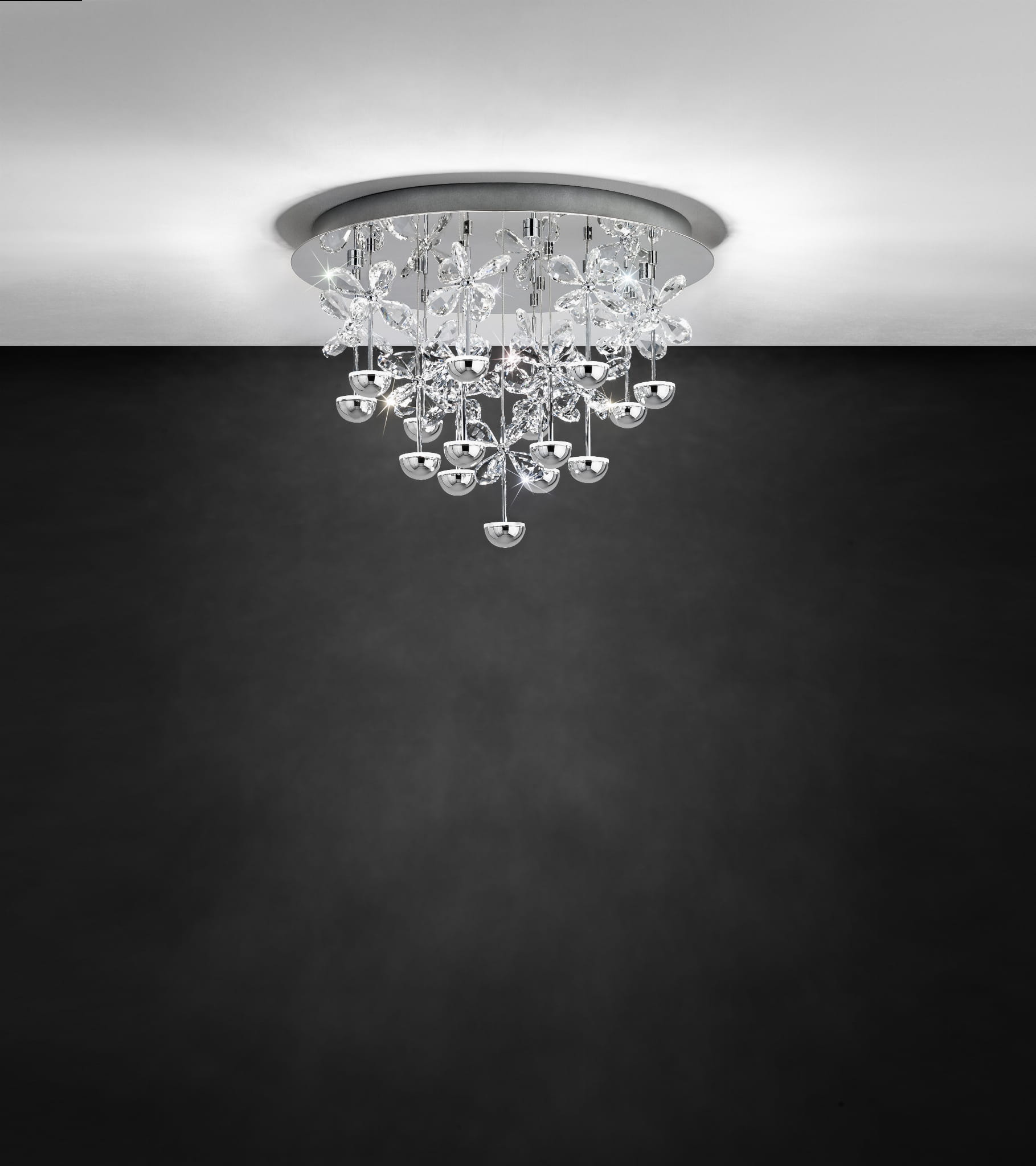 Mniejsza, ale równie niezwykła wersja innego plafonu z rodziny Pianopoli. Na chromowym plafonie (50cm) zawieszonych jest 15 punktów świetlnych. Każdy punkt to dyskretna chromowa półkula emitująca światło (3000K, 1,8W) w stronę pięknie je rozpraszających, niezwykle dekoracyjnych kryształów, dzięki czemu uzyskujemy fenomenalny efekt świetlny. Lampa przystosowana do ściemniaczy.